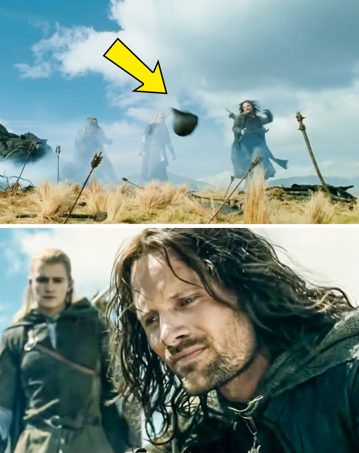 Під час зйомок сцени біля багаття Вігго Мортенсен повинен був штовхнути ногою важкий шолом орка. Актор ударив по шолому так сильно, що зламав собі пальці на нозі і закричав від болю. Епізод вийшов дуже пронизливим, а режисер Пітер Джексон був так вражений тим, що Мортенсен продовжував грати, незважаючи на серйозну травму, що включив у фільм саме цей дубль.