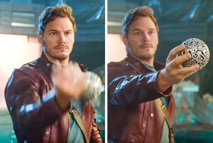 Насправді Кріс Претт випадково впустив сферу з Каменем Нескінченності, але при цьому залишився в образі. Творці фільму вирішили, що сцена виглядає дуже натурально, немов була прописана в сценарії, і цілком відповідає характеру Зіркового Лорда.