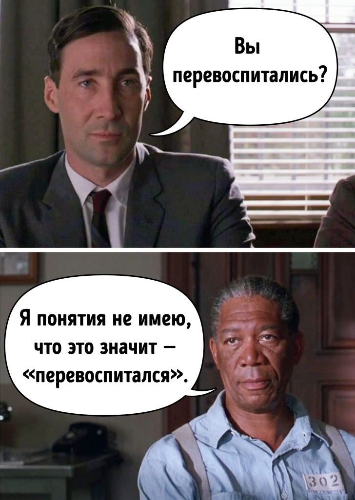 У висновку поступово формується залежність від тюремних стін. Спочатку їх ненавидиш, потім звикаєш, а після вже не можеш без них. Старого Брукса випустили на волю, коли він уже не міг жити в суспільстві, був непридатний для соціального життя. Цього ж чекали від Реда. Тому на слуханні йому постійно задавали один і той же питання: «Ви перевоспитались?» Тих, хто був довічно ув'язнений, випускають на волю лише тоді, коли вони повністю інституціалізовано і знеособлені.