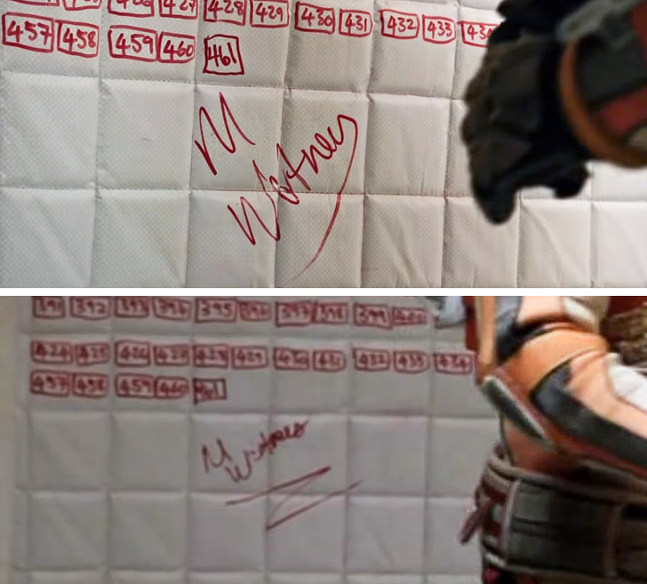 - Підпис Марка Уотни з фільму «Марсіанин», яку він залишає на стіні, в декількох кадрах виглядає абсолютно по-різному.