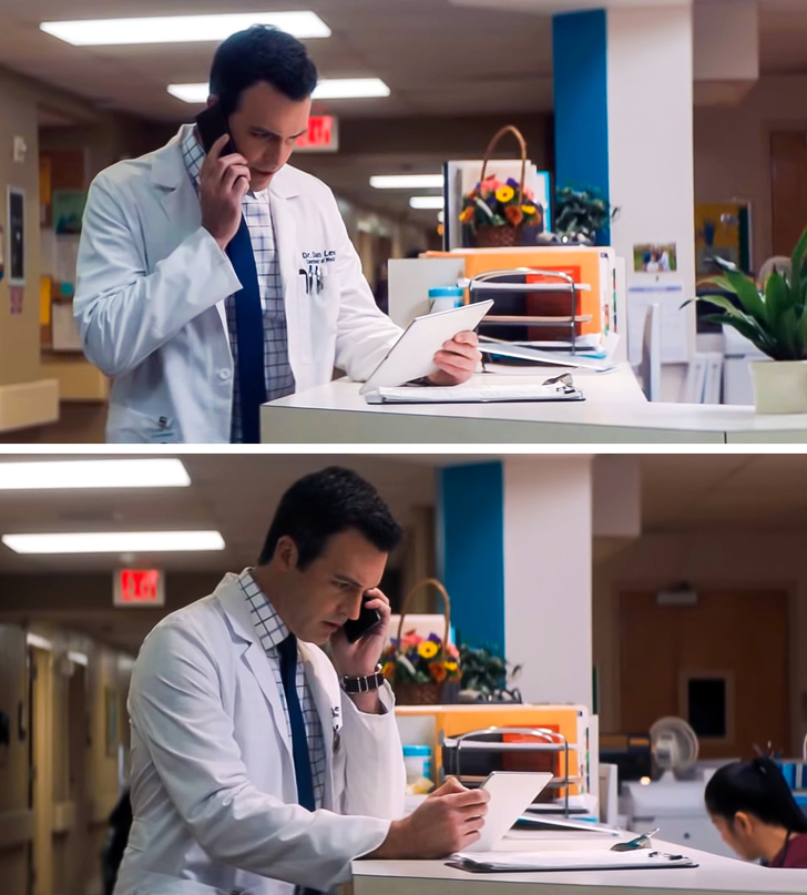 - Ден з «Венома» планшет тримає в правій руці, а телефон — в лівій, але вже в наступному кадрі гаджети магічним чином міняються місцями.