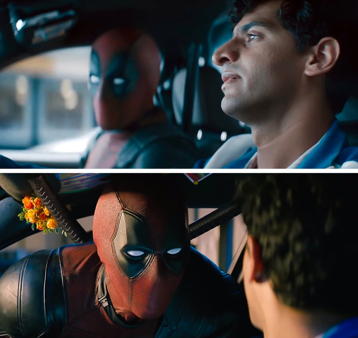 - В одній і тій же сцені другої частини «Дэдпула», де головний герой їде на таксі і спілкується з водієм, букетик квітів у правому кутку машини то з'являється, то зникає.