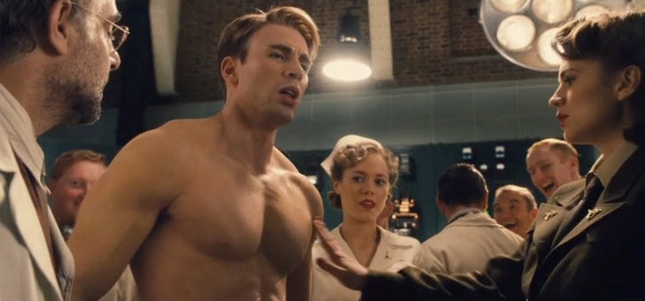 Ефектна сцена, коли Капітан Америка обзавівся ідеальним тілом, теж не обійшлася без імпровізації. У цьому епізоді героїня актриси Хейлі Етвелл відійшла від сценарію і інстинктивно доторкнулася до оголеного торсу Кріса Еванса. Цей момент вирішили залишити, щоб підкреслити привабливість нової зовнішності супергероя.