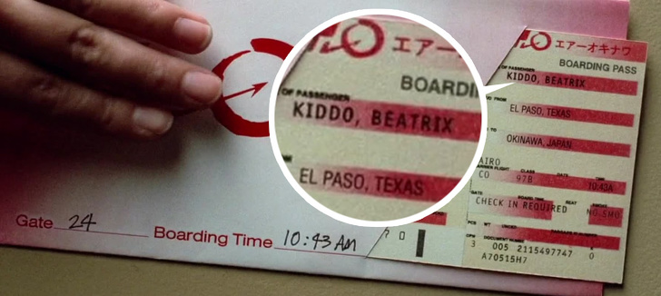 - У картині ніде не називається ім'я Нареченої, але уважні глядачі зможуть його знайти: коли в кадрі з'являється квиток в Японію, можна розгледіти і ім'я героїні Турман. Її звуть Беатрікс Кідд.