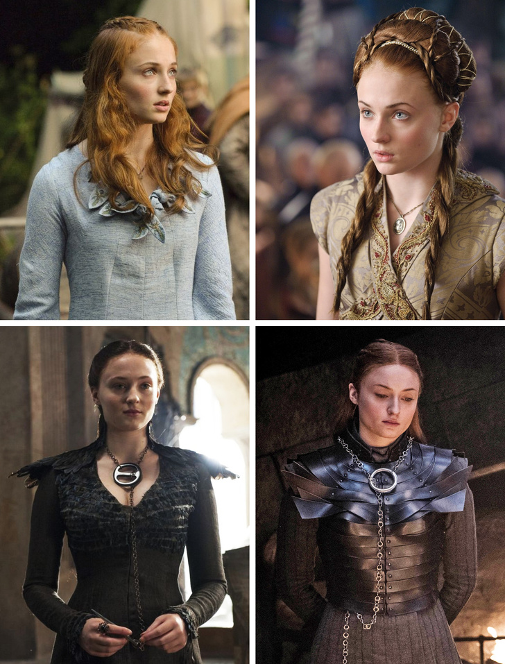 Коли дівчина шукає укриття у Бейлиша, то приховує своє «я» під чорними шатами і навіть змінює на чорний колір волосся. Її буквально оточують морок і небезпека. Нарешті, подолавши всі випробування, возз'єднавшись з братом і повернувшись у свій будинок, Санса одягається в строгі костюми, що імітують військові лати. Вона підкреслює твердість своїх намірів і заковує тіло в броню, щоб ніхто і ніщо більше не могло її поранити.