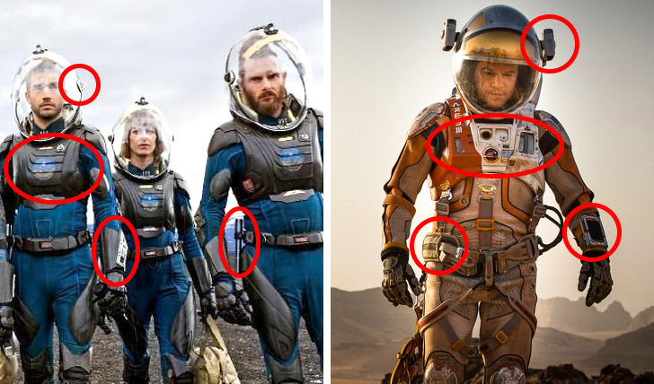 - Дизайн скафандрів у астронавтів на судні «Прометей» виглядає як вдосконалена версія скафандрів, які носять члени екіпажу місії Ares III.