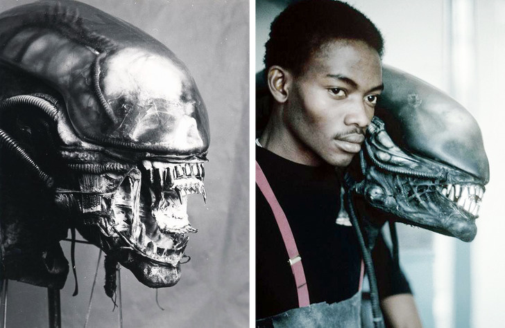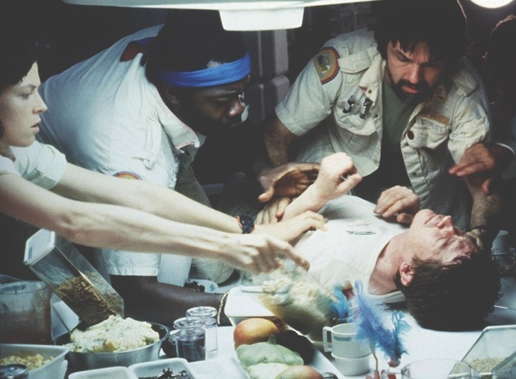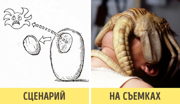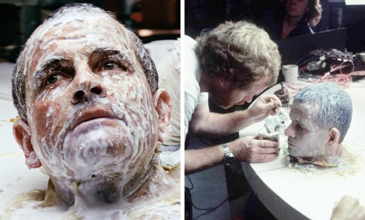 В кадрі, де на столі лежить голова андроїда Еша, його нутрощі зроблені з макаронів, ікри і мармурових кульок, залитих молоком. Цей напій Рідлі Скотт наливав акторові в рот перед кожним дублем, щоб рідина витікала у андроїда з рота, коли він говорить.