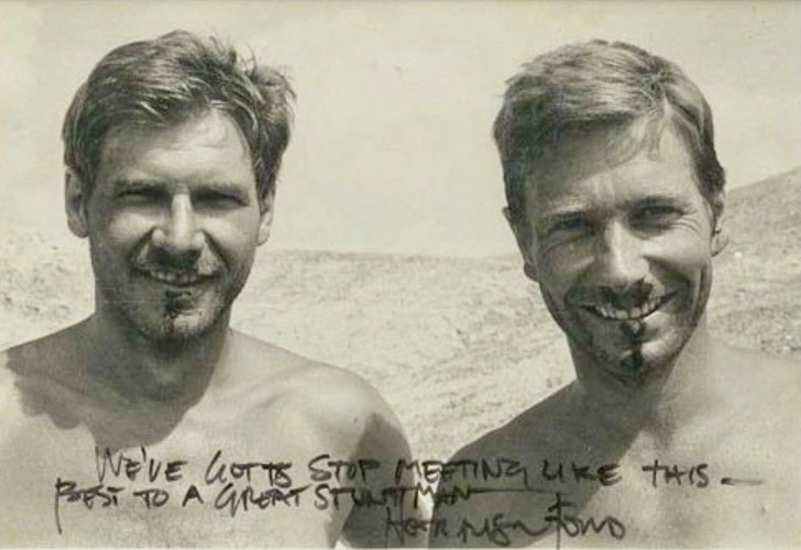 Під час зйомок сцени бійки з асасинів у фільмі «Індіана Джонс і Храм долі» Харрісон Форд пошкодив спину. Він був змушений летіти в Лос-Анджелес на операцію. Стівена Спілберга і знімальну команду виручив Вік Армстронг — постійний дублер Форда в цій франшизі. Зовнішністю і рухами Армстронг був настільки схожий на Форда, що знімальна команда постійно їх плутала. Більшість сцен з бійками і погонями зняли з дублером, а Харрісон Форд був показаний тільки на крупних планах, які зробили пізніше.