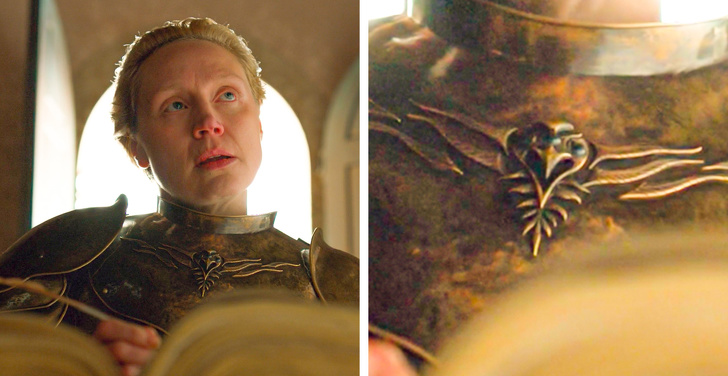 На броні Бриенны можна побачити знак нового короля: Бран обрав символом Трехглазого ворона, а не вовка Старков, як можна було б припустити.