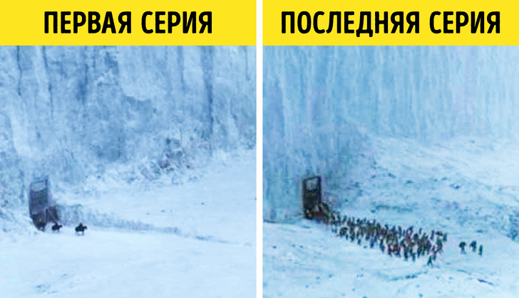 Серіал починається зі сцени, в якій 3 вершника відправляються в розвідку за Стіну, і закінчується він точно такий же сценою, тільки вершники вже інші йдуть разом з здичавілими, так і положення за Стіною зовсім інше. До речі, подорожні виходять з Чорного замку, а ось Король Ночі зруйнував Стіну біля Східного Дозору — саме з цієї причини нам показали неушкоджену Стіну.