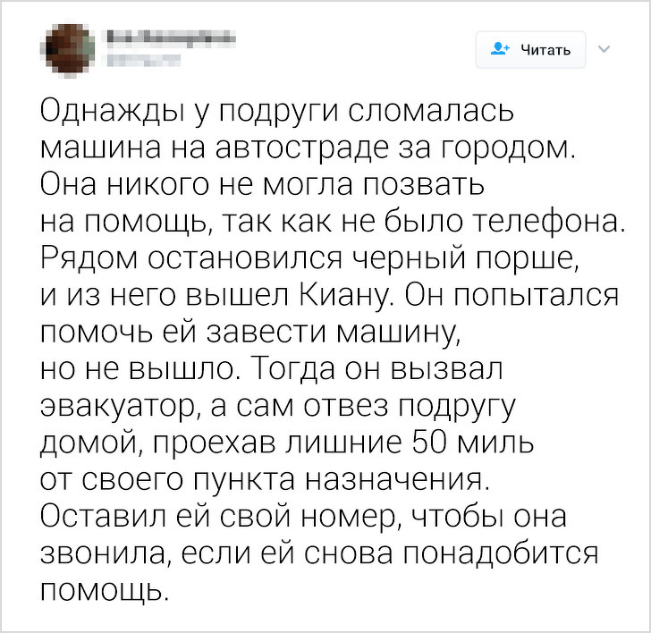 Ми в Social.org.ua давно вважаємо, що Кіану Рівз заслуговує особливої нагороди за свою доброту, тому перевели кілька оповідань фанатів для наших читачів.