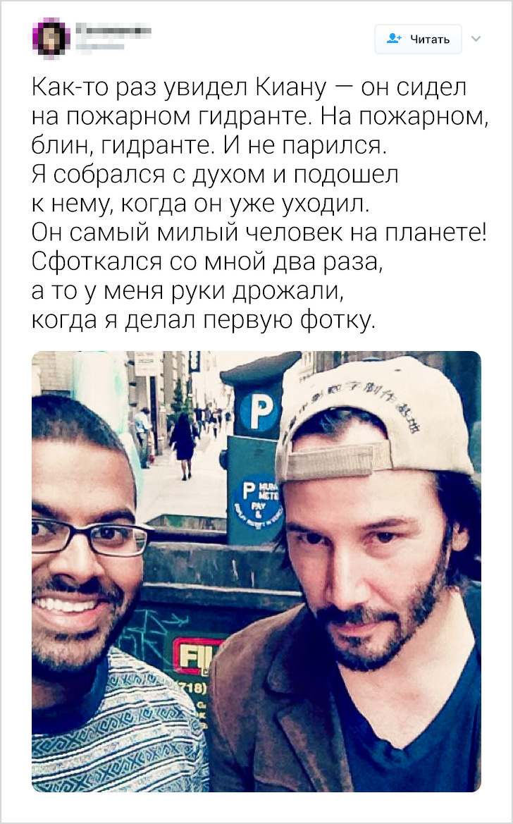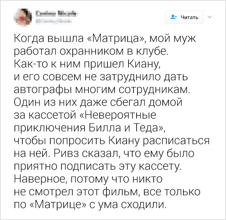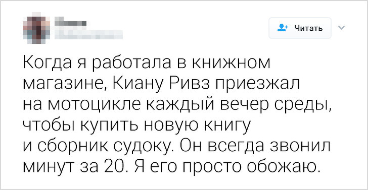 «Розповім-но я вам історію про Кіану Рівза в честь виходу „Джона Уіка — 3“. У 2001 році Кіану прийшов в кінотеатр в Сіднеї, в якому я працював. У той час він знімався в трилогії „Матриця“. Було тихе ранок середи — у кіно майже нікого. Стою я за касою, сумую жахливо, і тут заходить хлопець у джинсах, шкіряній куртці і шоломі. Дивний такий головний убір, ніби для верхової їзди. Мені не менше 30 секунд знадобилося, щоб відволіктися від шолома і зрозуміти, що переді мною Кіану Рівз. Він хотів купити квиток на фільм з Джонні Деппом „З пекла“.