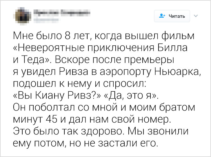 Мабуть, ніхто не здивується, якщо ім'я Кіану Рівза стане синонімом фрази «добра душа». Актор займається благодійністю і заслужив репутацію хорошого хлопця, незважаючи на те, що йому довелося пройти через безліч випробувань у житті, які будь-якого перетворили б в черствого циніка. Він завжди привітний з шанувальниками, і доказ тому — безліч історій, якими люди діляться в мережі.
