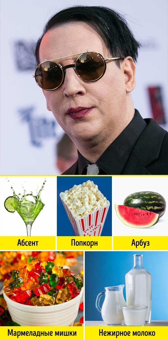 Перше, що спадає на думку при думці про списку побажань великого і жахливого містера Менсона, — чорні приміщення, опудала тварин, летючі миші на вікнах та інші страхітливі речі. Насправді райдер співака раптово нешкідливий і навіть умилителен. Одні мармеладні ведмедики Haribo чого варті. Їх він їсть відрами. Правда, запивати воліє абсентом.