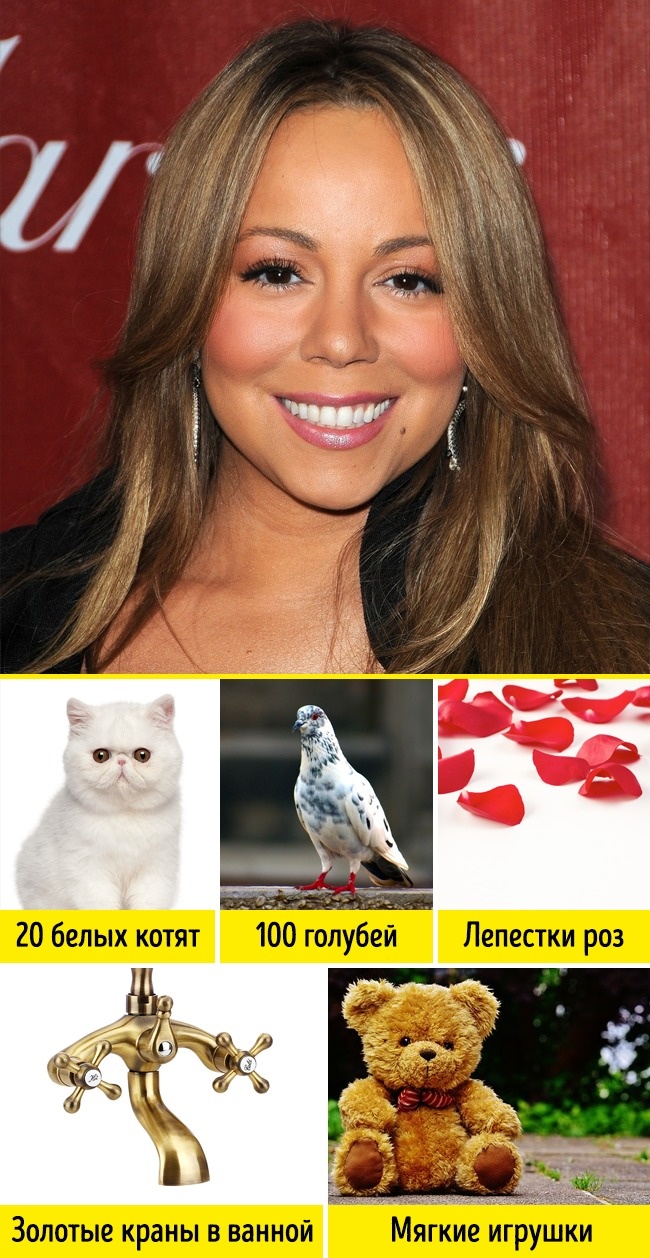 Одним з найфантастичніших бажань співачки є вимога надати їй 20 білих кошенят і 100 голубів. Порівняно з такими запити на кшталт наявності власної кімнати для собаки і золотих кранів у ванній якось меркнуть і здаються цілком нешкідливими і досить адекватними.