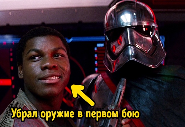 «Я був штурмовиком. Нас ще дітьми збирають з сімей, куди нам не повернутися, і ростять для однієї мети. Але в першому ж бою я для себе зрозумів, що я не вбивця. Я не повернуся до них», саме так Фін зізнався перед Рей. А ось сам епізод глядачеві так і не показали, хоча є віддалена сцена, яка пояснює рішення Фінна: у першому бою він зустрічає жінку з дитиною і прибирає зброю.