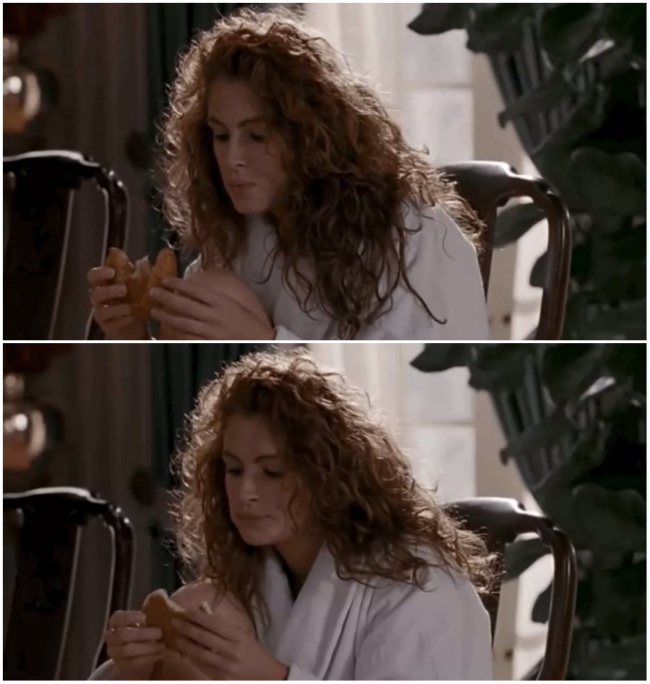 Круасан, який героїня Джулії Робертс їсть в цьому епізоді, в наступному кадрі несподівано перетворюється на оладки.