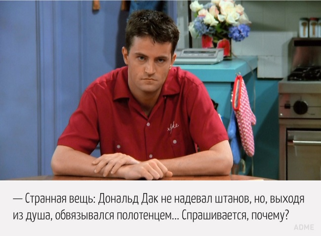 У кожного персонажа серіалу «Друзі» є своя відмінна риса, і у Чендлера це, без сумніву, його дотепність. Хоча оточуючі не завжди оцінюють саркастичные зауваження містера Бінга по достоїнству, для шанувальників серіалу багато його жарти стали улюбленими моментами.