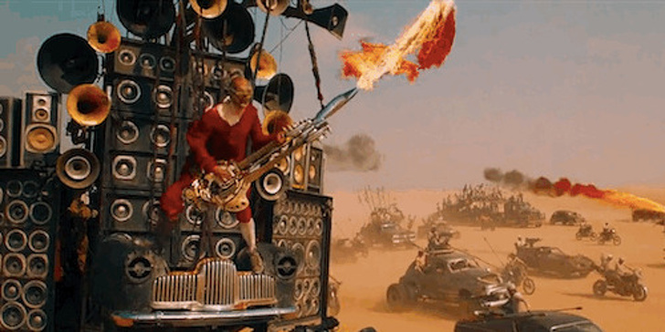 Мало того що гітара насправді стріляла полум'ям, на ній дійсно грали як на звичайній. Гітаристу довелося тренуватися близько 4-6 тижнів, щоб навчитися грати на спеціально сконструйованому для фільму інструменті, і все — на повній швидкості, в підвішеному стані і з зав'язаними очима.