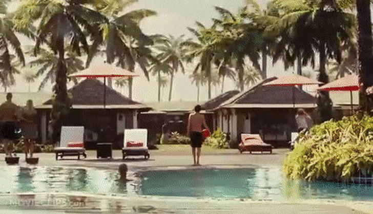 Для зйомок цієї руйнівної сцени була побудована модель курорту в масштабі 1:3. Бунгало, пальми, басейн, шезлонги — творці нічого не забули. Потім модель курорту знесли штучно створеної гігантською хвилею. Такий розмір моделі дозволив і воді, і самого курорту виглядати в кадрі правдоподібно.