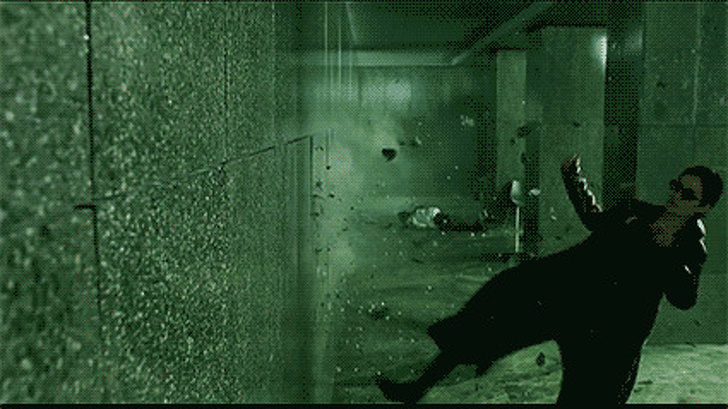 Цю сцену знімали 10 днів, використовуючи тільки фізичні спецефекти і ніякого CGI. До речі, Керрі-Енн Мосс зробила свій трюк зі стіною з одного дубля. Власне, цього від неї і чекали, адже щоб заново встановити підірвані колони, потрібно 6-8 годин.