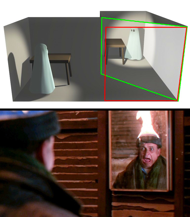 Акторові не довелося жертвувати своєю головою, адже на зйомках скористалися технікою ілюзіонізму «Привид Пеппера». Вона була розроблена ще в 1862 році для використання у театральних виставах і фокуси. Як це працює: в основному приміщенні під кутом 45° до глядача встановлено скло. За ним — прихована кімната. Коли та висвітлюється, об'єкти відбиваються в склі і здається, що зображення знаходиться у видимій кімнаті. У випадку з фільмом це був манекен з палаючою головою.