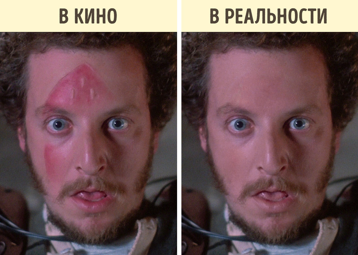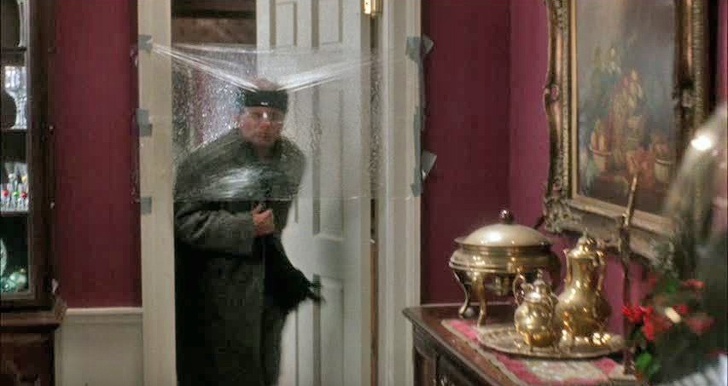 Інша відома сцена, яка багатьом може здатися кумедною, в реальному житті привела б до летального результату. Відтворюючи цю сцену, блогери розрахували, що банку з фарбою летить зі швидкістю 32 км/год. А сила удару в такому випадку була б в 2 рази більше, ніж у кулака легендарного Майка Тайсона. Зі стовідсотковою впевненістю можна сказати, що грабіжників в реальності чекав би нокаут або перелом черепа.