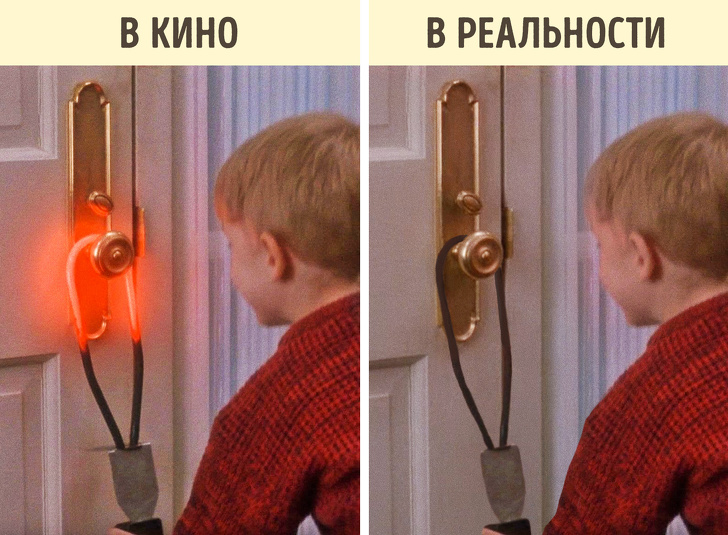 У фільмі Кевін використовує пристрій для розпалювання барбекю, щоб розігріти дверну ручку, за яку схопиться грабіжник, коли спробує увійти. В реальності блогер використовував аналогічний прилад, але повторити цей трюк він так і не зміг. За 30 хвилин експерименту блогеру вдалося нагріти внутрішню ручку дверей до 480 °С, у той час як температура зовнішньої ручки піднялася лише до 18 °С. Щоб прискорити процес, була використана газова пальник, з допомогою якої внутрішня ручка розжарився до 760 °С, а зовнішня нагрілася до 46 °С. Така температура, безумовно, неприємна, проте сильний опік при цьому малоймовірний.