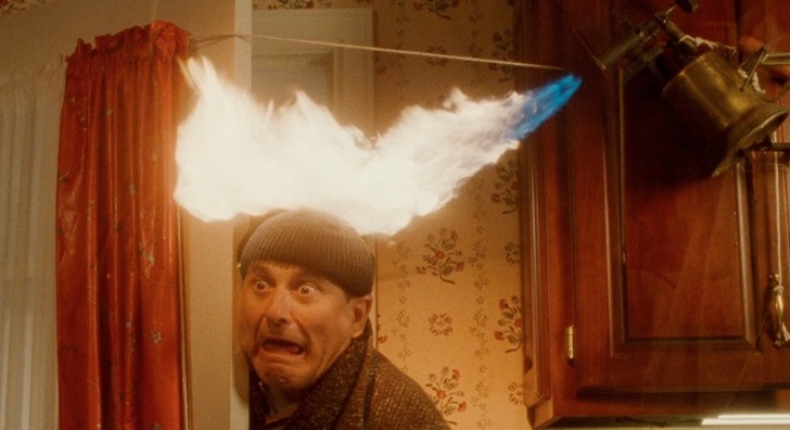Найбільш небезпечна пастка, яку влаштував Кевін, наздогнала одного з крадіїв на кухні. Шапку грабіжника підпалили газовим пальником, і він у подиві простояв так цілих 7 секунд, поки не здогадався засунути голову в сніг. У реальності, як стверджують лікарі, вистачило б менше однієї секунди, щоб отримати опік 3-го ступеня. А вже після такого тривалого впливу полум'я, як ми бачимо в сцені фільму, була б потрібна термінова госпіталізація. В експерименті блогери з США, на щастя, використовували голову манекена, яка постраждала значно більше, ніж герой фільму.