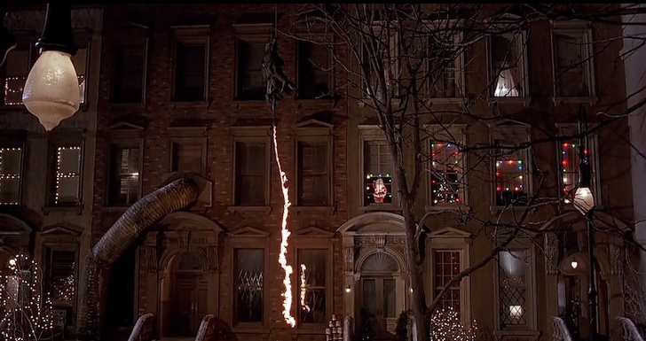 Багато хто, напевно, пам'ятає момент, коли злодії намагаються спуститися з даху на мотузці, щоб схопити Кевіна. Коли Марв і Гаррі застигають на рівні другого поверху, хлопчик підпалює трос, оскільки виявилося, що він був просякнутий гасом. Дивує, як злодії змогли так просто і так довго утримуватися на слизькій і мокрій мотузці.