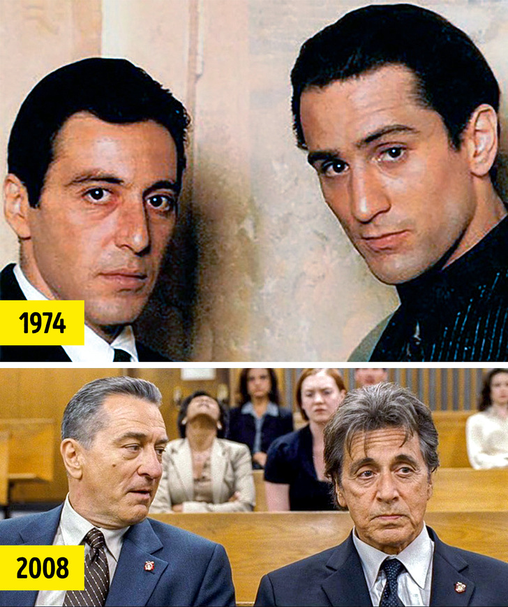 Вперше Аль Пачіно і Роберт Де Ніро знялися разом у легендарному фільмі «Хрещений батько — 2» в 1974 році. Забавно, але в одному кадрі метри не з'явилися ні разу. Де Ніро виконав роль молодого дона Корлеоне, а Аль Пачіно — його дорослого сина Майкла. Вдруге вони зустрілися на знімальному майданчику поліцейського трилера «Сутичка». Їх спільна сцена тривала всього 7 хвилин, але тим не менш отримала безліч захоплених відгуків. У 2019 році очікується прем'єра фільму «Ірландець» Мартіна Скорсезе, де актори виконають головні ролі.