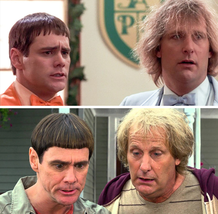 Джим Керрі (Ллойд Крісмас) і Джефф Деніелс (Гаррі Данн) у фільмах «Тупий і ще тупіший» 1994 р. і «Тупий і ще тупіший — 2» 2014 р.