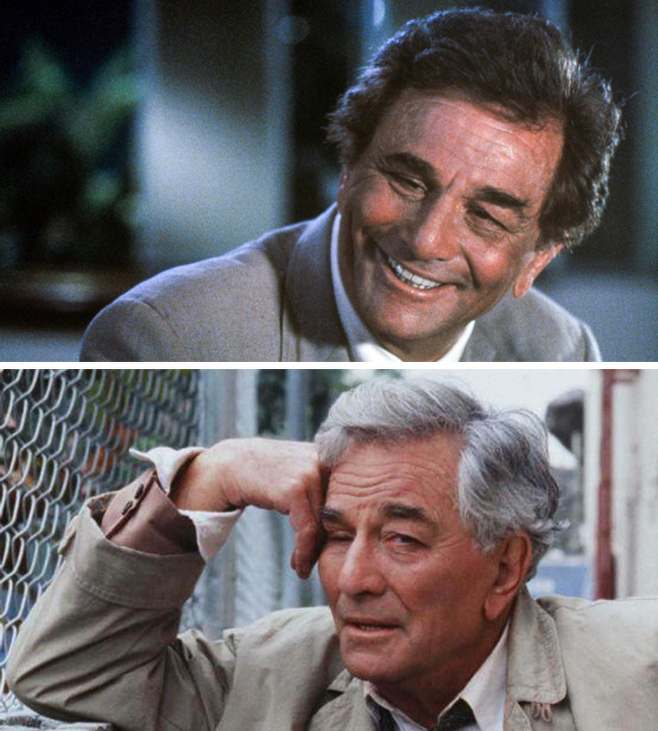 Пітер Фальк (лейтенант Коломбо) в серіалі «Коломбо» 1968 р. і фільмі «Коломбо подобається нічне життя» 2003 р.