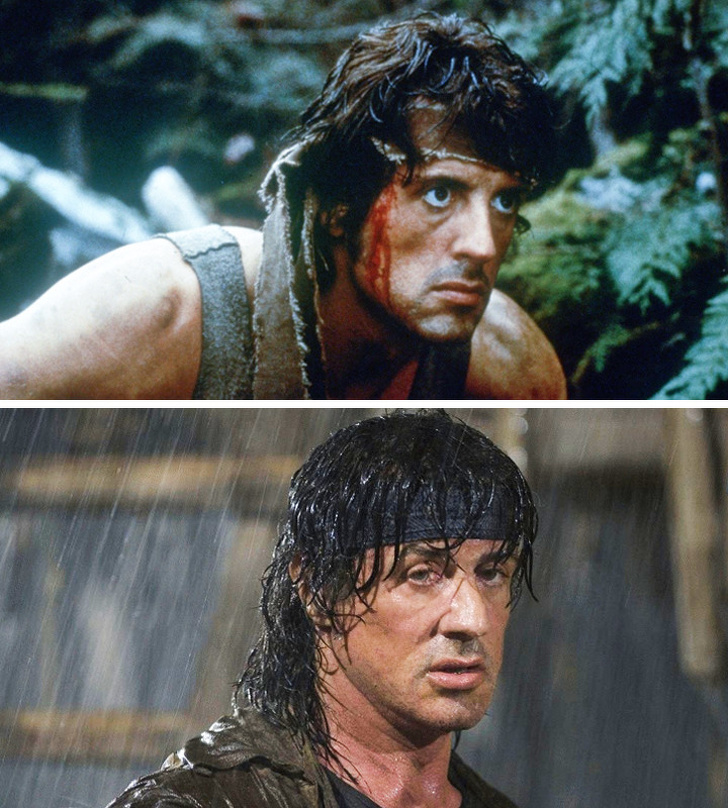 Сильвестр Сталлоне (Джон Рембо) у фільмах «Рембо: Перша кров» 1982 р. і «Рембо IV» 2008 р.