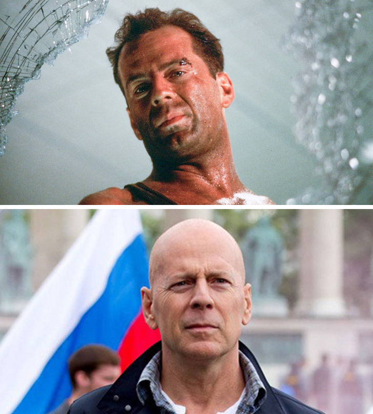 Брюс Вілліс (Джон Макклейн) у фільмах «Міцний горішок» 1988 р. і «Міцний горішок: Хороший день, щоб померти» 2013 р.