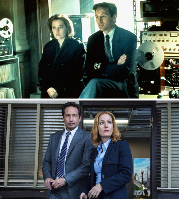 Девід Духовни (Фокс Малдер) і Джилліан Андерсон (Дана Скаллі) в серіалі «Секретні матеріали» — 1-й сезон 1993 р. і 10-й сезон 2016 р.