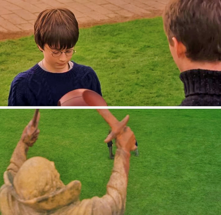 Сцена, в якій Олівер Вуд розповідає Гаррі про квиддиче і показує м'ячі. На крупному плані за спиною Гаррі добре видно доріжка, а на загальному навколо хлопців немає нічого, крім газону.
