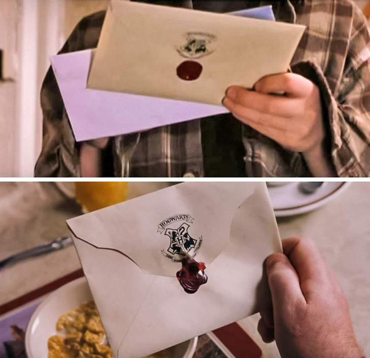 Гаррі Поттер забирає перше листа з Гоґвортсу і несе його у вітальню, де лист потрапляє в руки дядька Вернона. За цей короткий час друк не тільки помітно викривилася, але ще й зрушила з місця і залізла на герб Хогвартса.