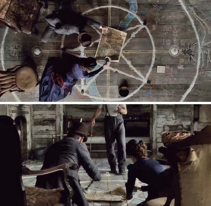 Доктор Ватсон та Ірен розкладають на підлозі карту і притискають її краю за допомогою підсвічника і гуртки. Все б добре, але навіщо вони двічі повторюють одне і те ж дію?