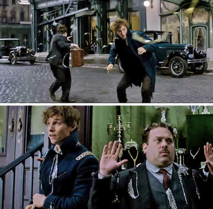 У сцені, де розбивається вітрина з прикрасами, намиста летять прямо в героїв, але їм вдається вправно від них ухилятися. А через мить Ньют і Ковальські вже обвішані прикрасами з ніг до голови. Магія!