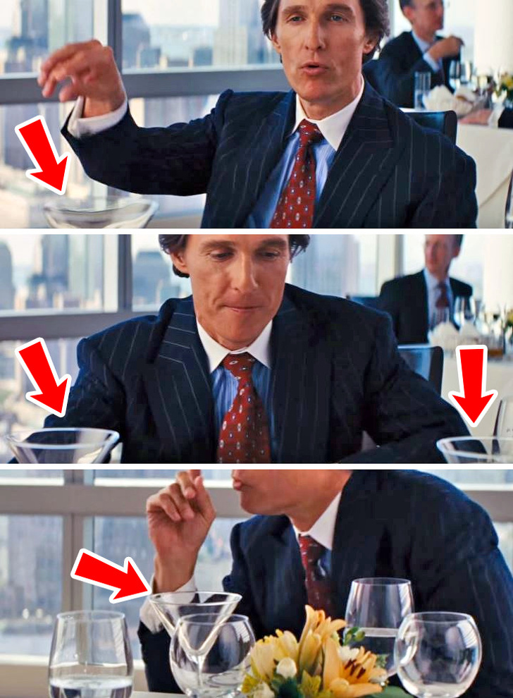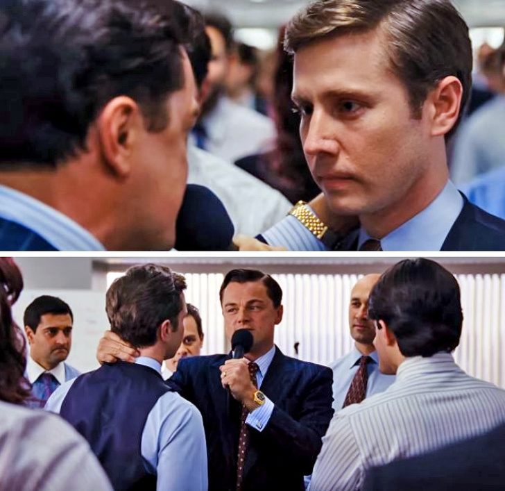 В одній зі сцен Джордан Белфорт по-батьківськи кладе руку на плече співробітника: спочатку це ліва рука, а в правій він тримає мікрофон. Через мить руки змінюються: мікрофон виявляється в лівій руці, а права розташовується на плечі юнака.