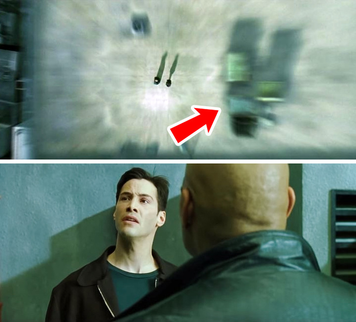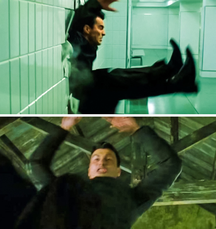 Пам'ятаєте сцену в першому фільмі трилогії, коли Нео і Морфеус переміщуються на дах? На загальному плані добре видно, що герої стоять як мінімум в декількох метрах від невеликої будівлі, але в наступному кадрі ми бачимо це ж будову прямо за спиною Нео.