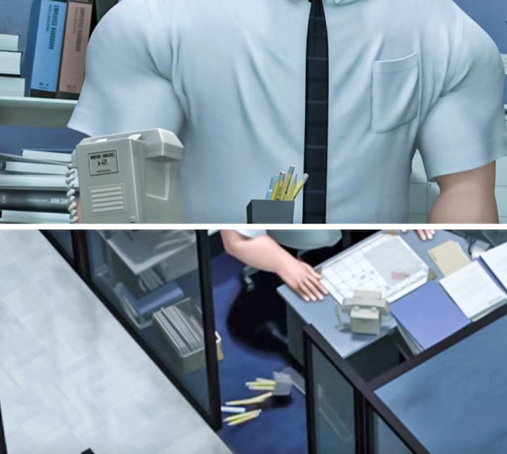 Сцена в офісі Боба: спочатку стакан коштує рівно посередині столу, але буквально в наступному кадрі плюхається з самого краю на підлогу.