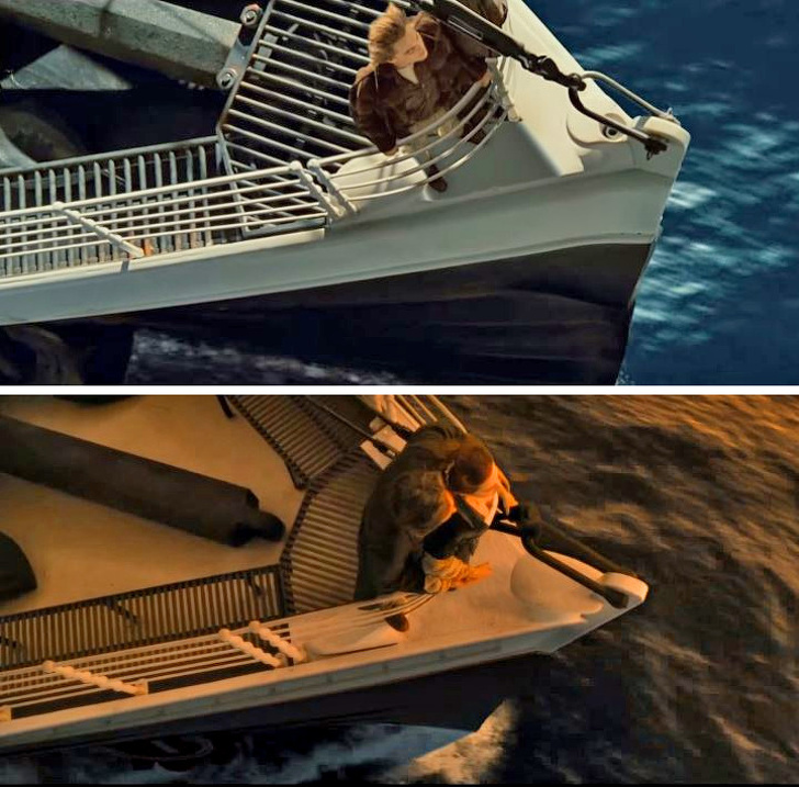 Зйомки фільму з рекордним для свого часу бюджетом супроводжувалися масою труднощів, в числі яких було і встановлення декорацій. Мабуть, кіношники трохи перемудрили з ними: в одній зі сцен ми бачимо Джека стоять на носовій частині корабля, але коли він приводить туди Роуз (та сама культова сцена), дизайн все тієї ж носовій частині виглядає вже помітно іншим.