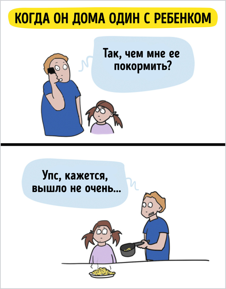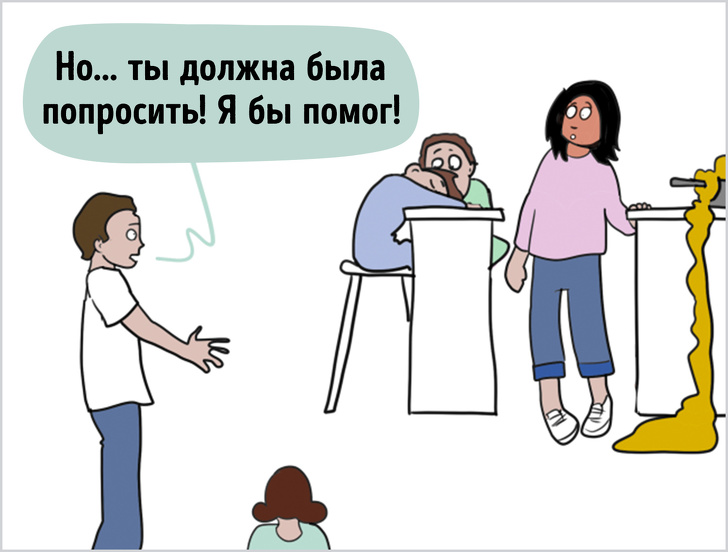 Емма звертає увагу на наступний момент: прохання допомогти чоловік часто сприймає дуже буквально і робить тільки те, про що її попросили. «Коли я прошу дістати з посудомийної машини пляшечку для малюка, він дістає тільки пляшечку, не розбираючи іншу посуд», «Він не здогадається поміняти дитині підгузник, поки я не скажу про це», «Він ніколи не приготує окреме блюдо для малюка», — такі приклади наводять подруги Емми. Можливо, чоловіки просто не здогадуються про те, що виконали лише малу частину справи? Хоча, безумовно, жінки дуже раді будь-якій допомозі.