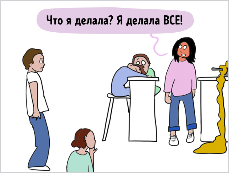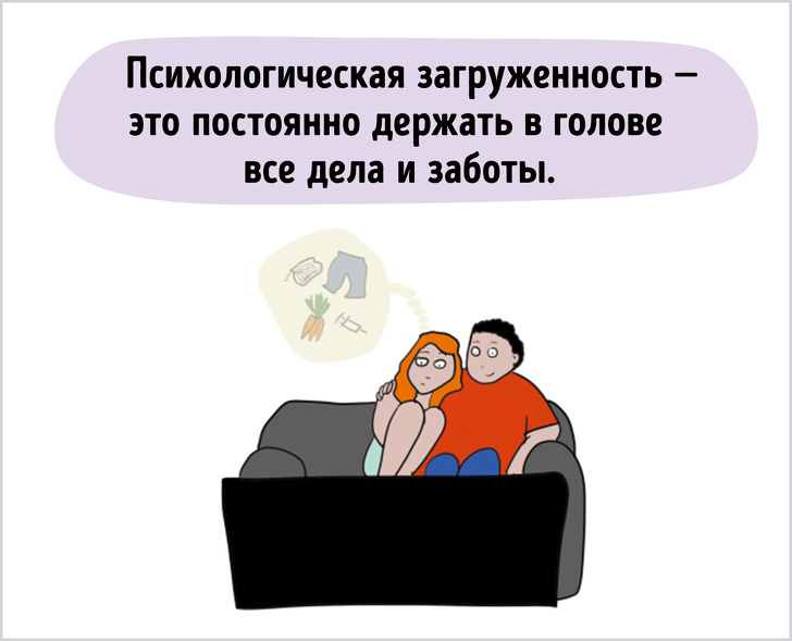 При цьому жінка, як правило, займається не тільки господарством і дітьми, вона ходить і на роботу. Вона намагається встигнути виконати все, що запланувала, і нічого не забути. Емма називає це психологічної завантаженістю. «Це постійна і виснажлива робота. І вона невидима», — пише Емма.