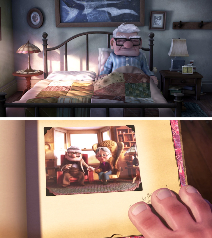 Якщо придивитися уважніше, то можна помітити, що багато речей, що належать Карлу, мають квадратну форму. А речі Еллі — округлу.