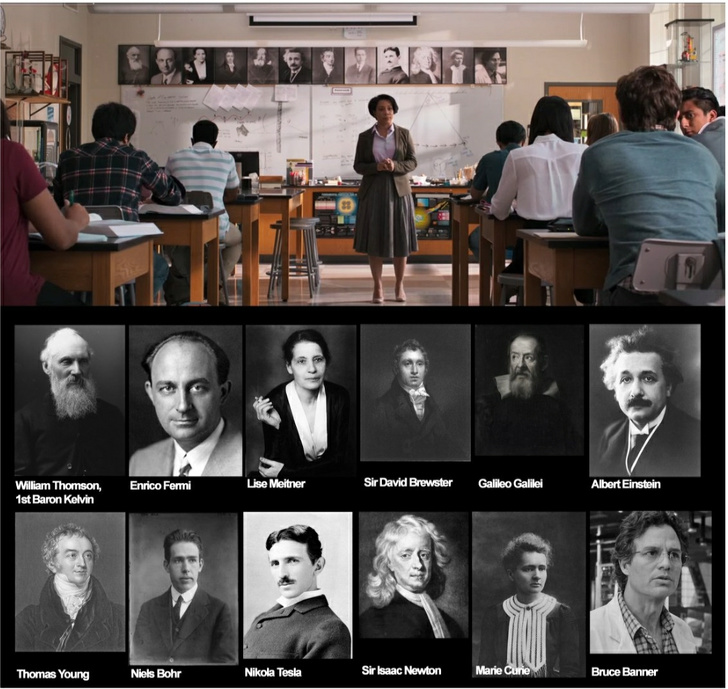 У класі фізики є стіна з портретами вчених. Серед них — портрет Брюса Беннера (внизу праворуч), відомого вченого в галузі біохімії, ядерної фізики і гамма-випромінювання у всесвіті Marvel. Ще він здатний перетворюватися в зеленого монстра — Халка.