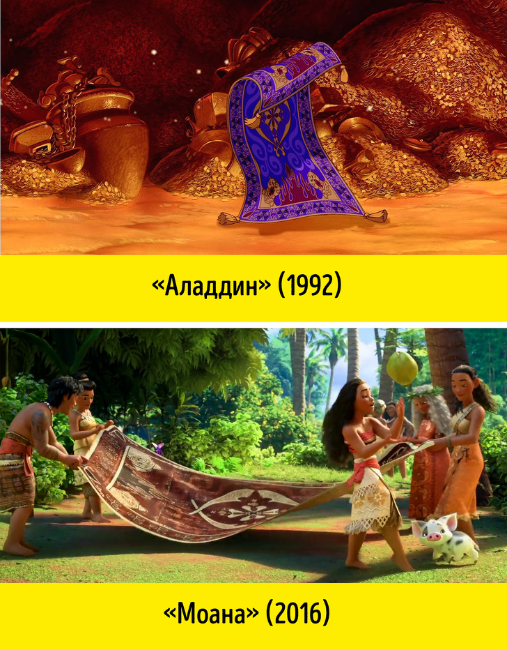 В одній зі сцен у мультфільмі «Моана» жителі острова розстеляють килим, який має такий вже візерунок, як і літаючий килим у «Аладдін».