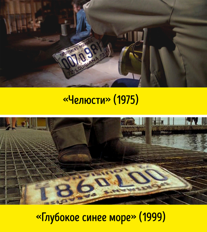 На початку фільму «Глибоке синє море» один з головних героїв викидає на пірс номерний знак з тими ж символами, які були нанесені на знак, витягнений з черева акули у фільмі жахів «Щелепи».
